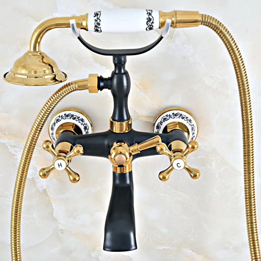 Reviews Black Gold Color Brass Wall Mount Bathroom Tub Faucet Dual Cross Handles Telephone Style Hand Showe